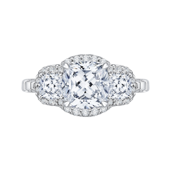 14K White Gold Cushion Cut Three-Stone Diamond Halo Engagement Ring (Semi-Mount)